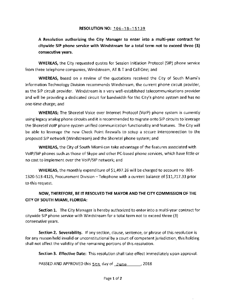 RESOLUTION NO: 1061815139 A Resolution authorizing the City Manager to enter into a multiyear contract for citywide SIP phone service with Wind stream for a total term not to exceed three (3) consecutive