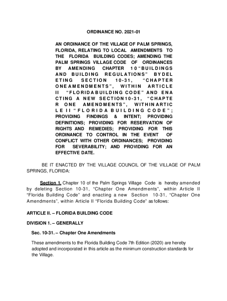 ORDINANCE NO. 202101 AN ORDINANCE OF THE VILLAGE OF PALM SPRINGS, FLORIDA, RELATING TO LOCAL AMENDMENTS TO THE FLORIDA BUILDING CODES; AMENDING THE PALM SPRINGS VILLAGE CODE OF ORDINANCES BY AMENDING