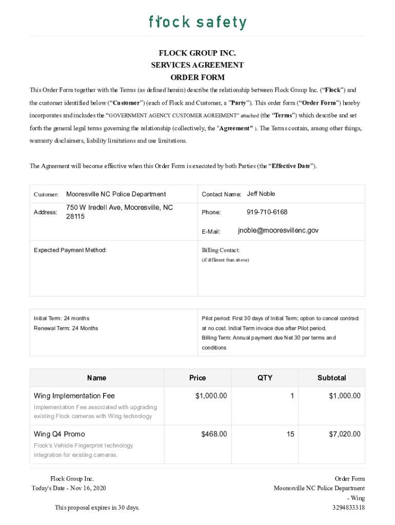 FLOCK GROUP INC. SERVICES AGREEMENT ORDER FORM This Order Form together with the Terms (as defined herein) describe the relationship between Flock Group Inc. (Flock) and the customer identified below