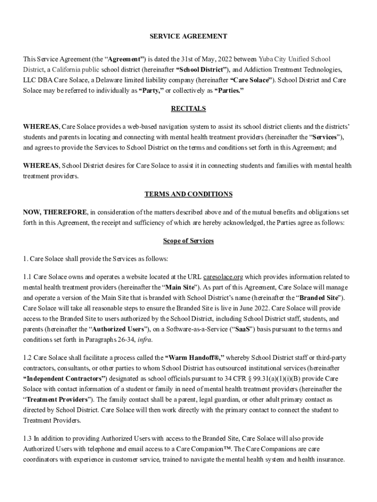 SERVICE AGREEMENT This Service Agreement (the Agreement) is dated the 31st of May 2022 between Cuba City Unified School District, a California public school district (hereinafter School District),