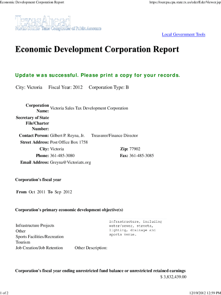 Economic Development Corporation Report1 of 2https://Europa.CPA.state.tx.us/edcr/EdcrViewer.jspLocal Government ToolsUpdate was successful. Please print a copy for your records. City: VictoriaFiscal