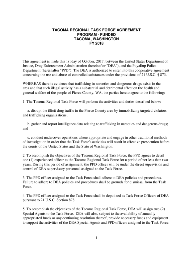 TACOMA REGIONAL TASK FORCE AGREEMENT PROGRAM FUNDED TACOMA, WASHINGTON FY 2018This agreement is made this 1st day of October 2017, between the United States Department of Justice, Drug Enforcement