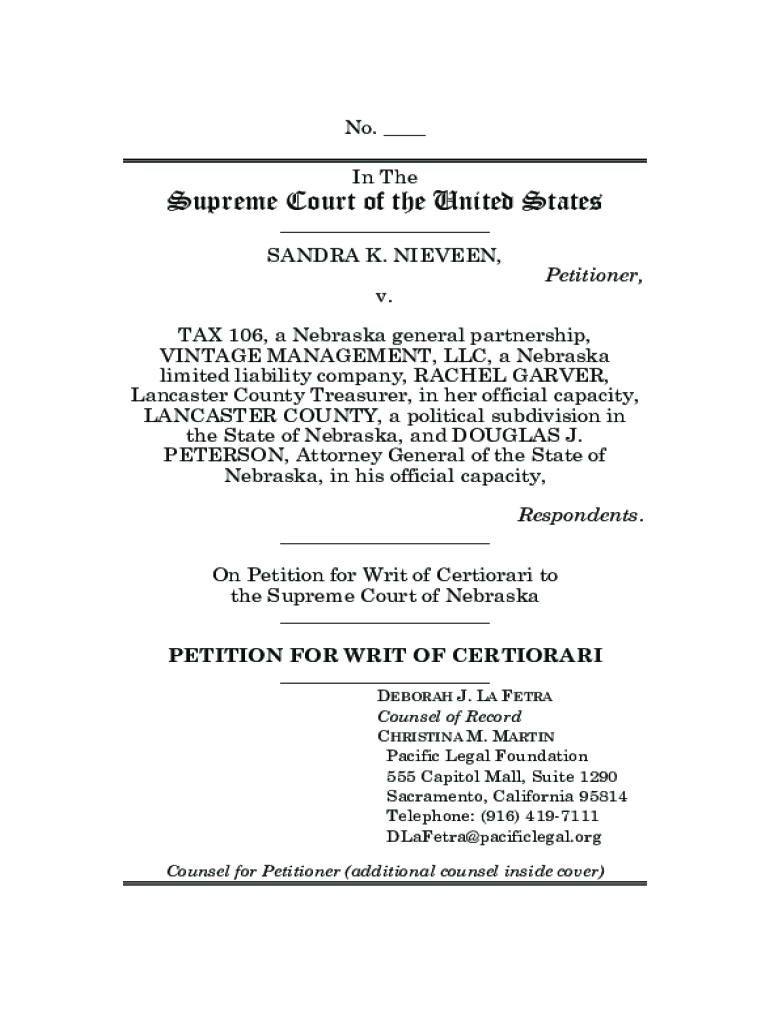 No. ___ In Supreme Court of the United States ___SANDRA K. NINETEEN, v. Petitioner, TAX 106, a Nebraska general partnership, VINTAGE MANAGEMENT, LLC, a Nebraska limited liability company, RACHEL GARNER,
