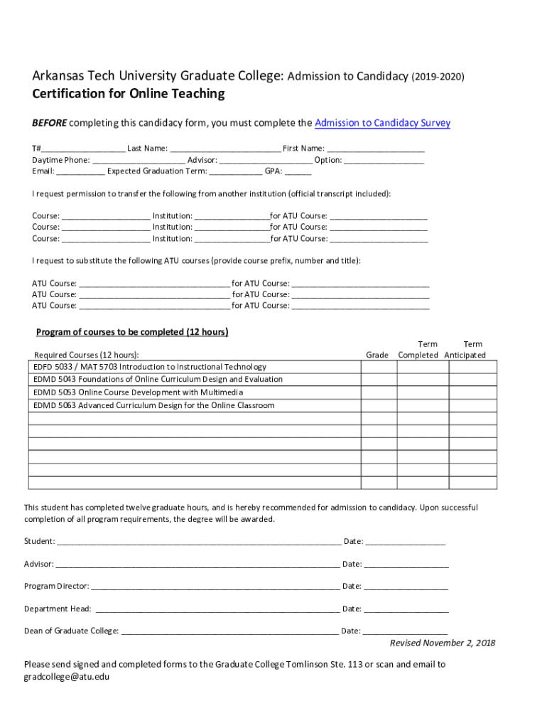 Arkansas Tech University Graduate College: Admission to Candidacy (20192020) Certification for Online Teaching BEFORE completing this candidacy form, you must complete the Admission to Candidacy Survey