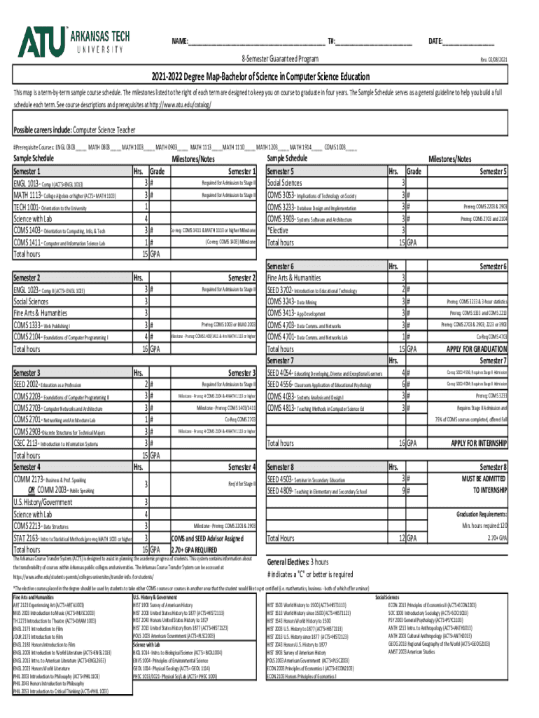 NAME:___ T#:___DATE:___8Semester Guaranteed Program Rev. 02/08/202120212022 Degree Bachelor of Science in Computer Science Education This map is a terabytes sample course schedule. The milestones