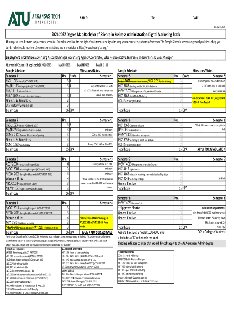 NAME:___ T#:___ DATE:___ Rev. 02/25/202120212022 Degree Bachelor of Science in Business AdministrationDigital Marketing Track This map is a terabytes sample course schedule. The milestones listed
