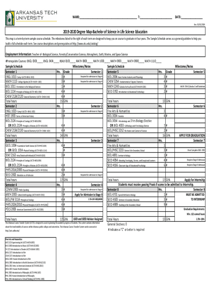NAME:___ T:___DATE:___ Rev. 03/01/201920192020 Degree Bachelor of Science in Life Science Education This map is a terabytes sample course schedule. The milestones listed to the right of each term