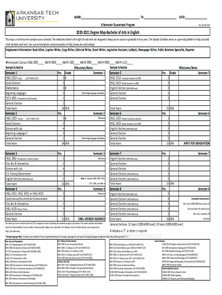 NAME:___ T#:___DATE:___8Semester Guaranteed ProgramRev.02/05/202020202021 Degree Bachelor of Arts in English This map is a terabytes sample course schedule. The milestones listed to the right of each
