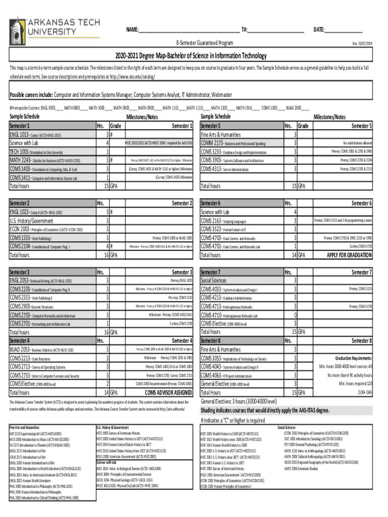NAME:___ T#:___DATE:___8Semester Guaranteed Program Rev. 02/07/201920202021 Degree Bachelor of Science in Information Technology This map is a terabytes sample course schedule. The milestones listed