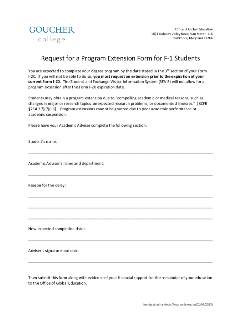 Office of Global Education 1021 Delaney Valley Road, Van Meter, 116 Baltimore, Maryland 21204Request for a Program Extension Form for F1 Students You are expected to complete your degree program by