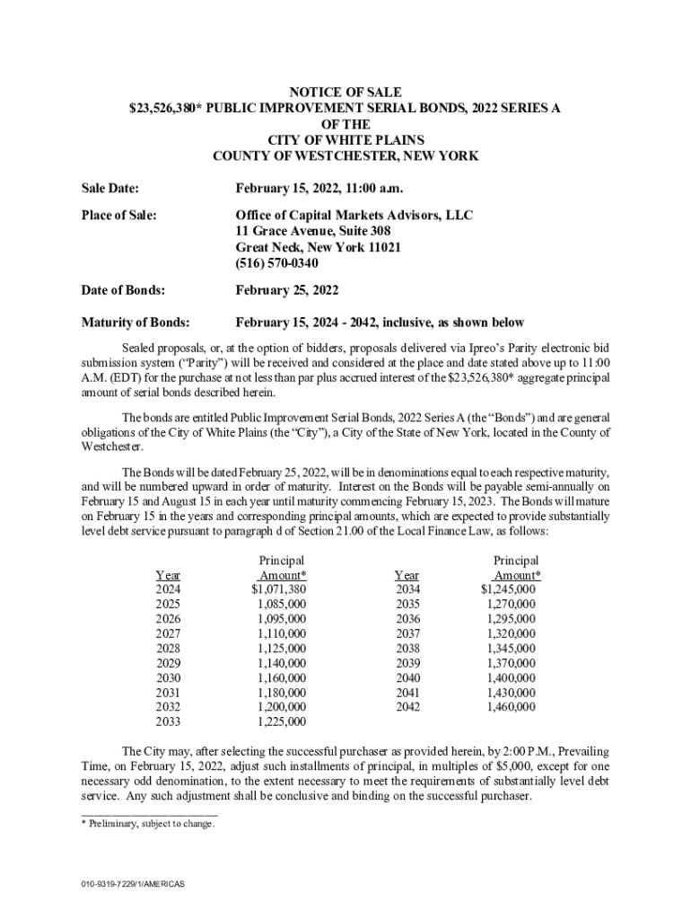 NOTICE OF SALE $23,526,380* PUBLIC IMPROVEMENT SERIAL BONDS, 2022 SERIES A OF THE CITY OF WHITE PLAINS COUNTY OF WESTCHESTER, NEW YORK Sale Date:February 15, 2022, 11:00 a.m. Place of Sale:Office