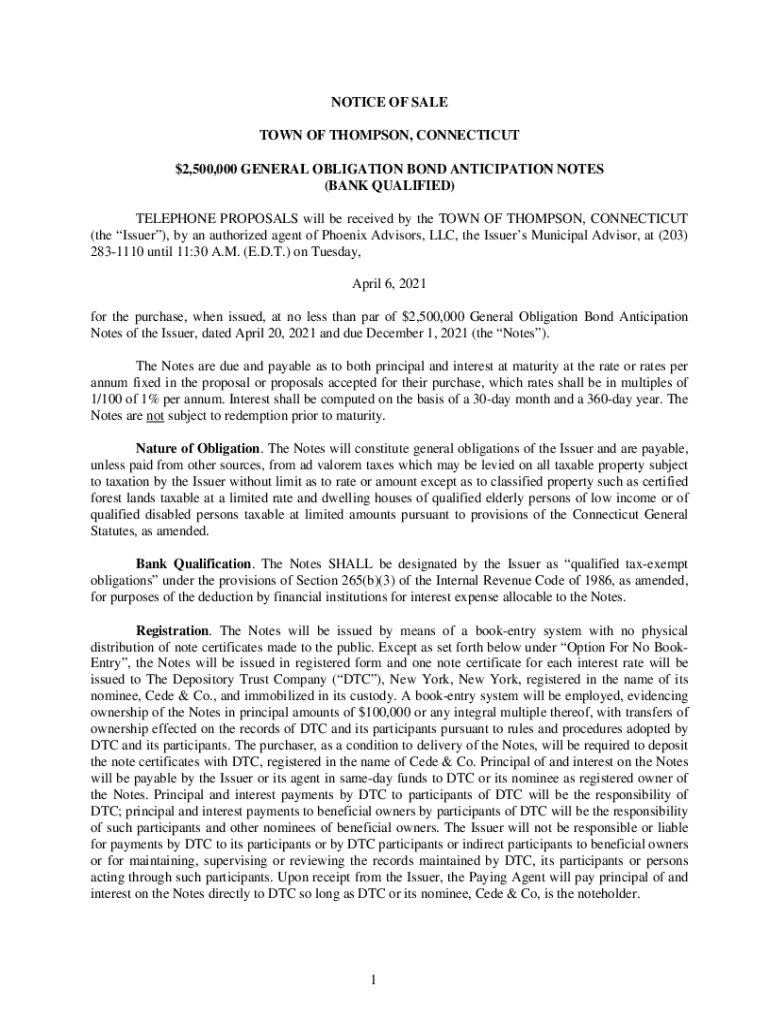 NOTICE OF SALE TOWN OF THOMPSON, CONNECTICUT $2,500,000 GENERAL OBLIGATION BOND ANTICIPATION NOTES (BANK QUALIFIED) TELEPHONE PROPOSALS will be received by the TOWN OF THOMPSON, CONNECTICUT (the Issuer),