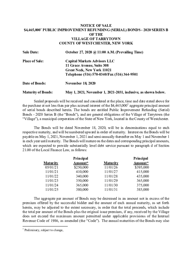 $4,465,000×NOTICE OF SALE PUBLIC IMPROVEMENT REFUNDING (SERIAL) BONDS 2020 SERIES B OF THE VILLAGE OF TARRAGON COUNTY OF WESTCHESTER, NEW Yorkshire Date:October 27, 2020 @ 11:00 A.M. (Prevailing