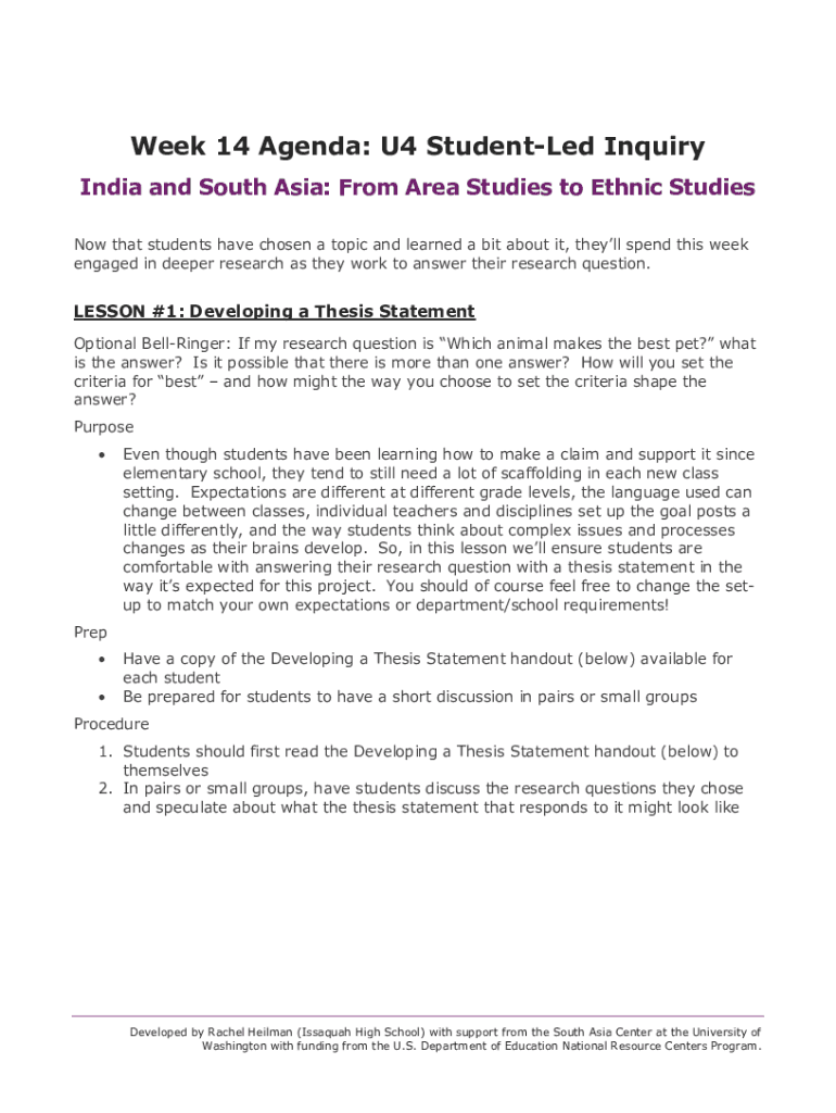 Week 14 Agenda: U4 Students Inquiry India and South Asia: From Area Studies to Ethnic Studies Now that students have chosen a topic and learned a bit about it, they'll spend this week engaged in deeper
