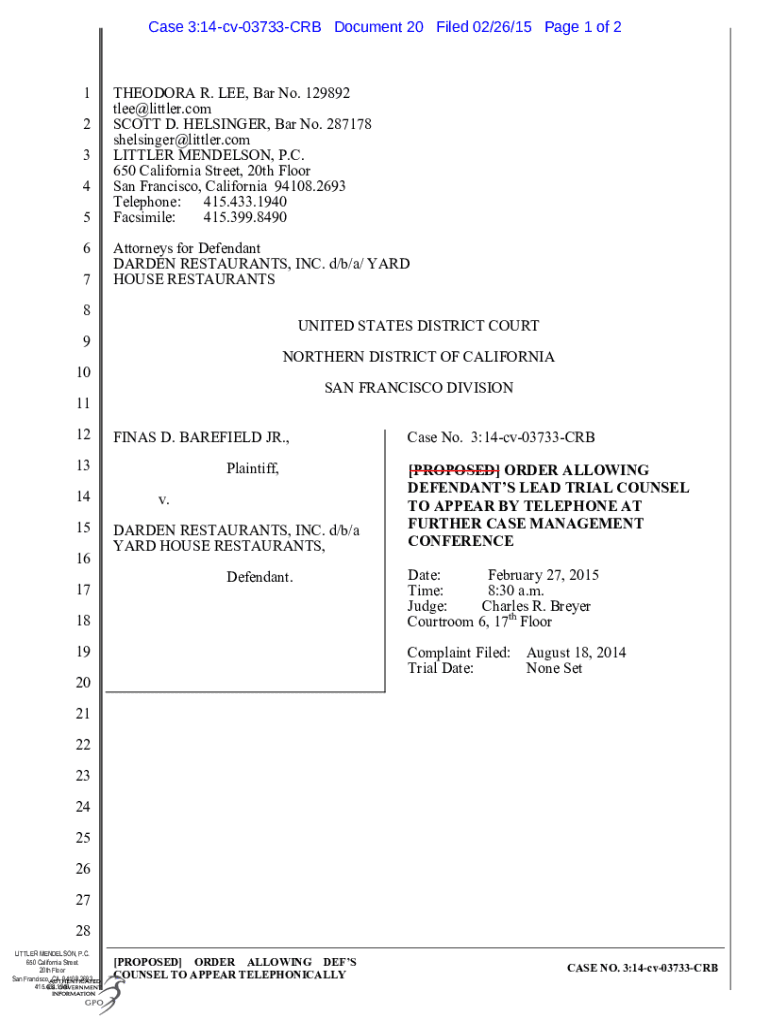 Case 3:14cv03733CRB Document 20 Filed 02/26/15-Page 1 of 21 2 3 4 5 6 7THEODORA R. LEE, Bar No. 129892 tlee@littler.com SCOTT D. BELLINGER, Bar No. 287178 shelsinger@littler.com LITTLER MENDELSOHN,