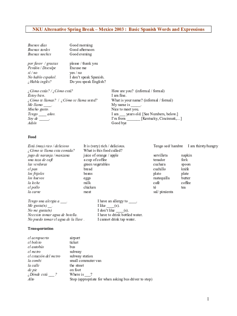 NU Alternative Spring Break Mexico 2003 : Basic Spanish Words and Expressions Burns was Buena trades Buena nochesGood morning Good afternoon Good evening favor / gracias Peron / Disciple s / no No