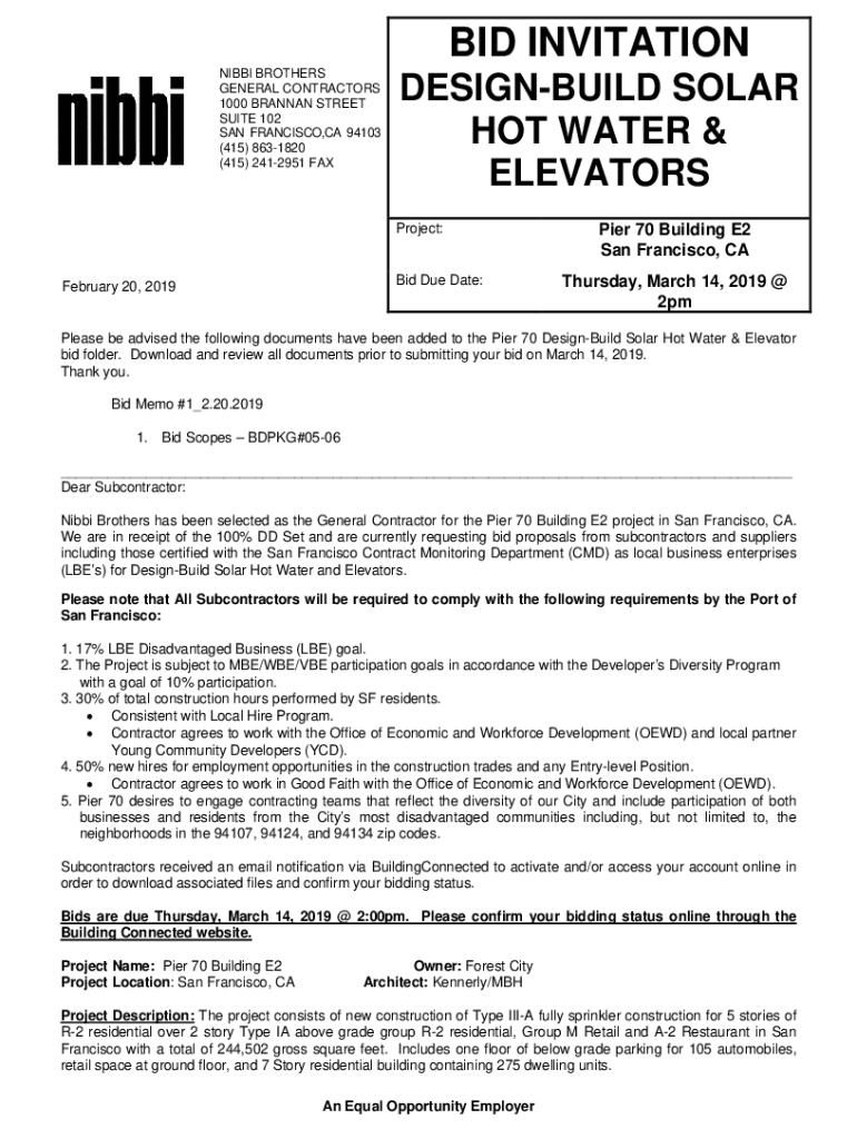 BID INVITATION NIMBI BROTHERS GENERAL CONTRACTORS 1000 BRENNAN STREET SUITE 102 SAN FRANCISCO, CA 94103 (415) 8631820 (415) 2412951 FAXDESIGNBUILD SOLAR HOT WATER & ELEVATORS Project:Bid Due Date:February