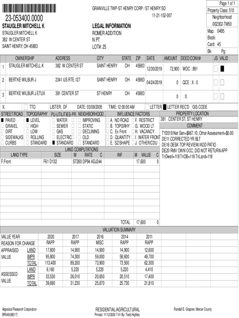 *230534000000×GRANVILLE TWIST HENRY CORP / ST HENRY SD 1121152007STAUGLER MITCHELL LEGAL INFORMATIONSTAUGLER MITCHELL K 382 W CENTER ST SAINT HENRY, OH 45883ROMER ADDITION N PT LOT#: 2523053400.00001OWNERSHIP