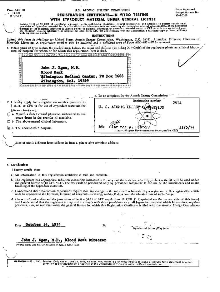 Get the free US. ATOMIC ENERGY COMMISSION REGISTRATION CERTIFICATE-IN VITRO TESTING ...