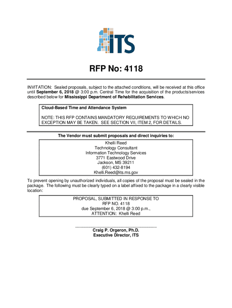 RFP No: 4118 INVITATION: Sealed proposals, subject to the attached conditions, will be received at this office until September 6, 2018 @ 3:00 p.m. Central Time for the acquisition of the products/services