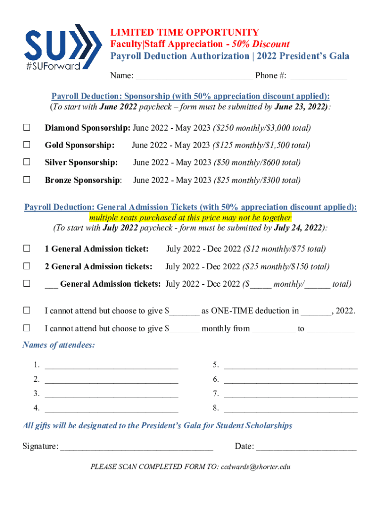 LIMITED TIME OPPORTUNITY Faculty|Staff Appreciation 50% Discount Payroll Deduction Authorization | 2022 Presidents Gala Name: ___ Phone #: ___ Payroll Deduction: Sponsorship (with 50% appreciation