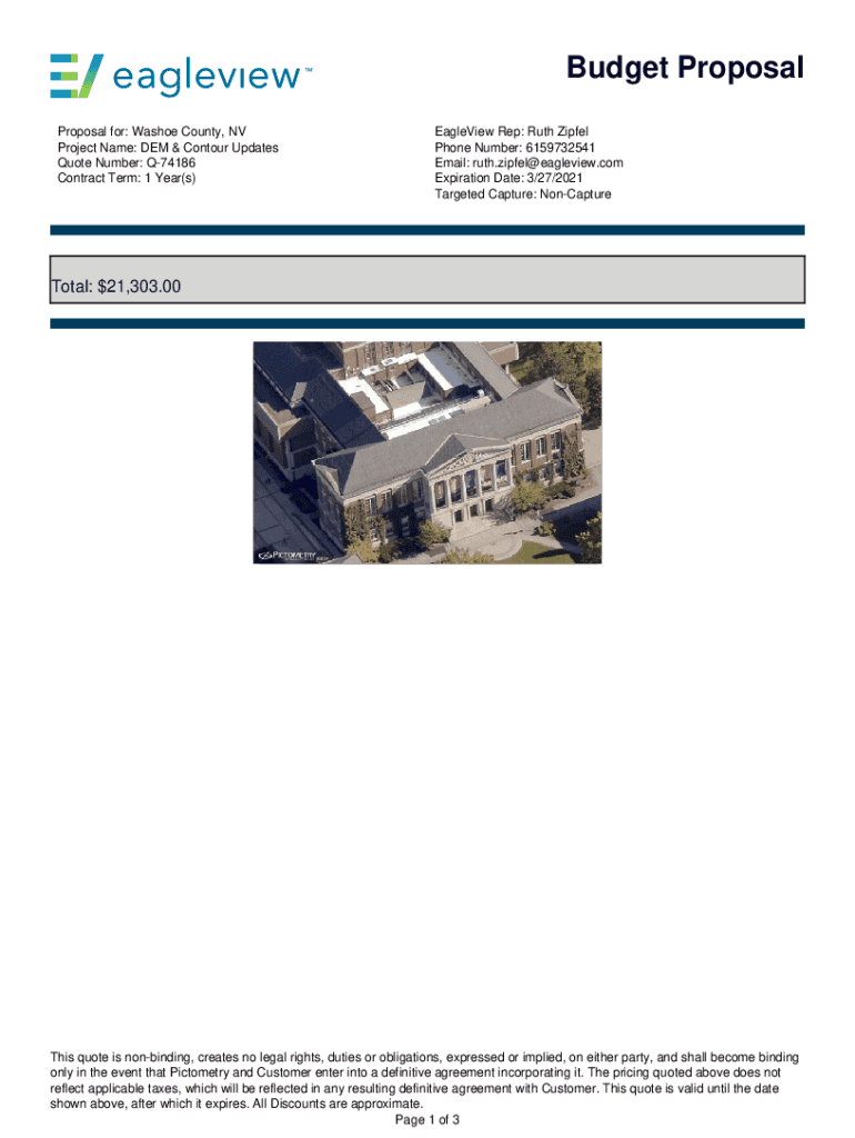 Budget Proposal for: Washoe County, NV Project Name: DEM & Contour Updates Quote Number: Q74186 Contract Term: 1 Year(s)Glenview Rep: Ruth Eiffel Phone Number: 6159732541 Email: ruth.zipfel@eagleview.com