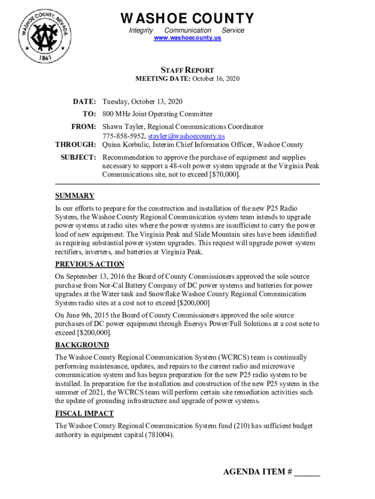 WASHOE COUNTY IntegrityCommunicationServicewww.washoecounty.staff REPORT MEETING DATE: October 16, 2020DATE: Tuesday, October 13, 2020, TO: 800 MHz Joint Operating Committee FROM: Shawn Taylor, Regional