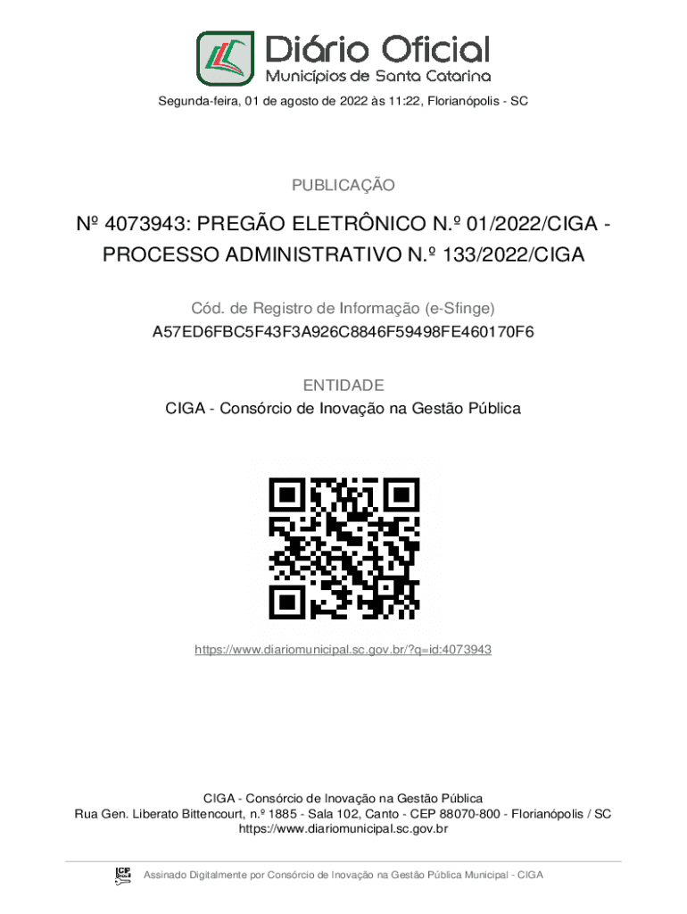 Segundafeira, 01 de Acosta de 2022 s 11:22, Florianópolis REPUBLICAN 4073943: PRESO ELECTRIC N. 01/2022/CIA PROCESS ADMINISTRATIVE N. 133/2022/CIA Cd. DE Registry de Informao (singe) A57ED6FBC5F43F3A926C8846F59498FE460170F6ENTIDADE