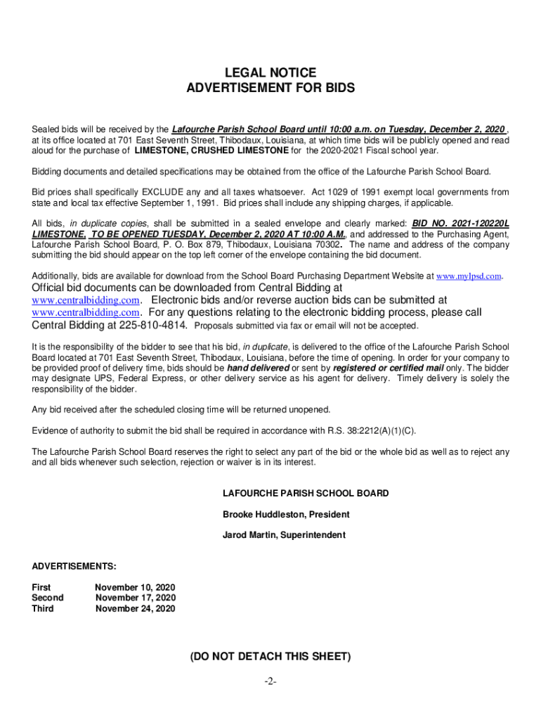 LEGAL NOTICE ADVERTISEMENT FOR BIDS Sealed bids will be received by the Louche Parish School Board until 10:00 a.m. on Tuesday, December 2, 2020, at its office located at 701 East Seventh Street,