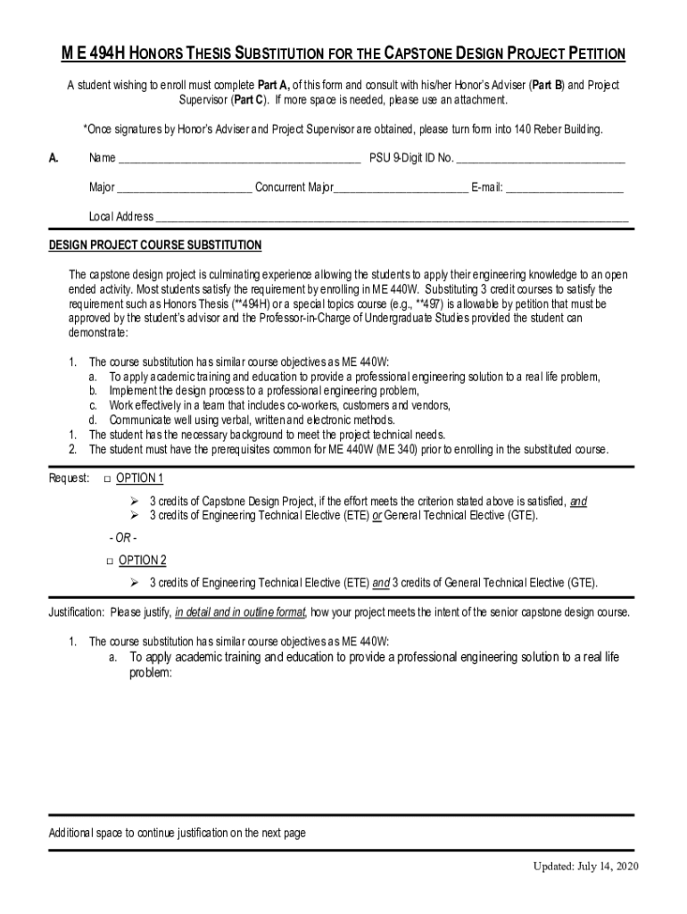 M E 494H HONORS THESIS SUBSTITUTION FOR THE CAPSTONE DESIGN PROJECT PETITION A student wishing to enroll must complete Part A, of this form and consult with his/her Honors Adviser (Part B) and Project