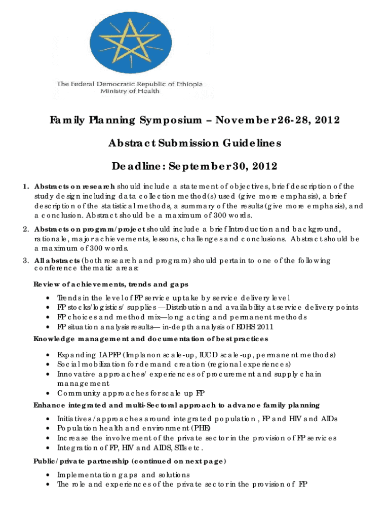 Family Planning Symposium November 2628, 2012 Abstract Submission Guidelines Deadline: September 30, 2012 1. Abstracts on research should include a statement of objectives, brief description of the