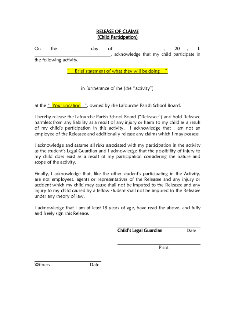 RELEASE OF CLAIMS (Child Participation) On this ___ day of ___, 20___, I, ___, acknowledge that my child participate in the following activity. Brief statement of what they will be doing in furtherance