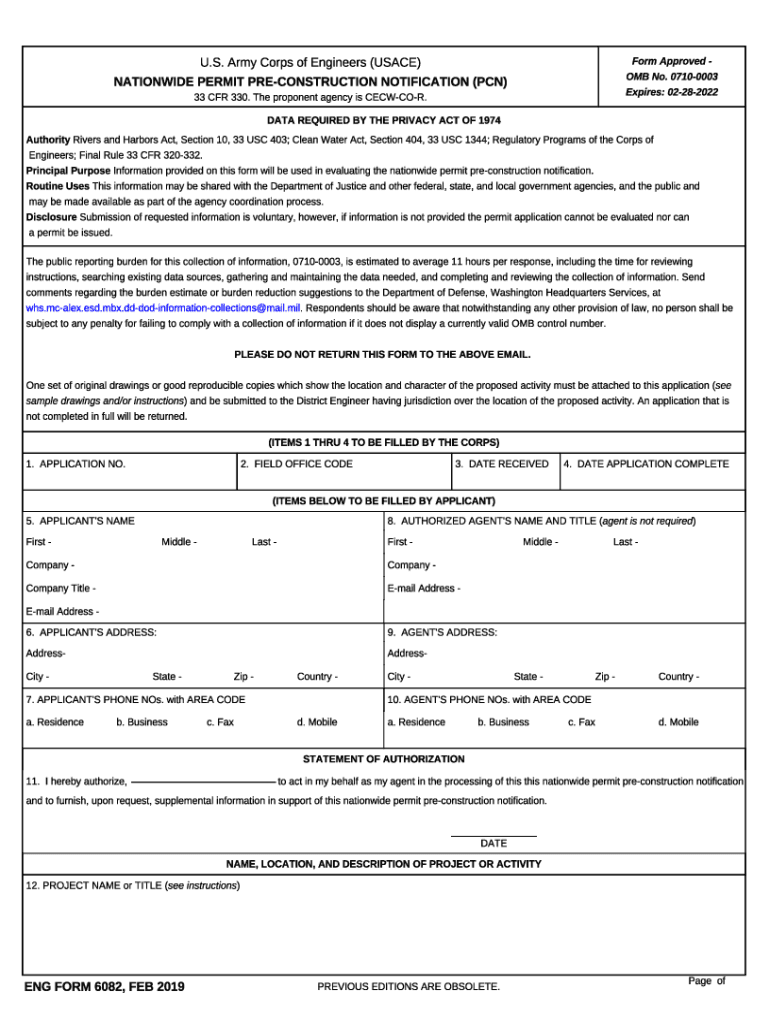 To fill out the nationwide permit pre-construction notification, applicants must complete a specified form that includes details about the project location, the nature of the work, any potential environmental impacts, and measures to mitigate those impacts.