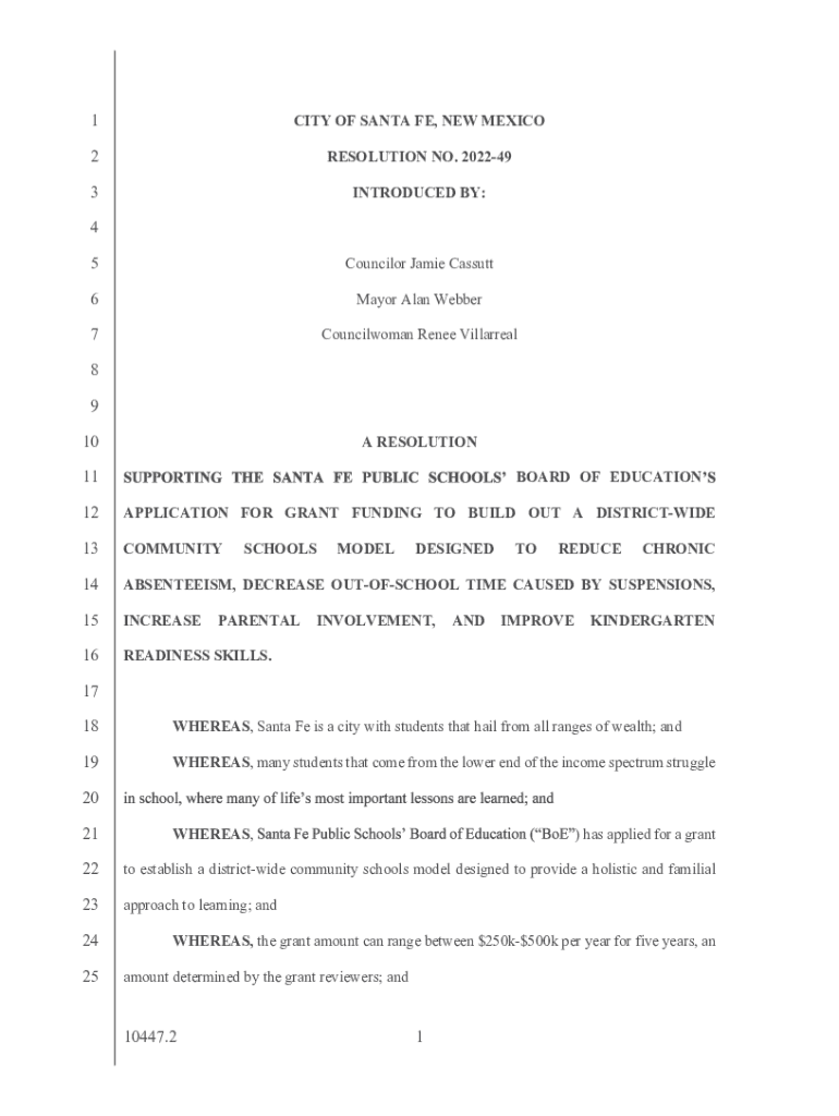 1CITY OF SANTA FE, NEW MEXICO2RESOLUTION NO. 2022493INTRODUCED BY:4 5Councilor Jamie Cassutt6Mayor Alan Webber7Councilwoman Renee Villarreal8 9 10A RESOLUTION11BOARD OF EDUCATION12APPLICATION FOR