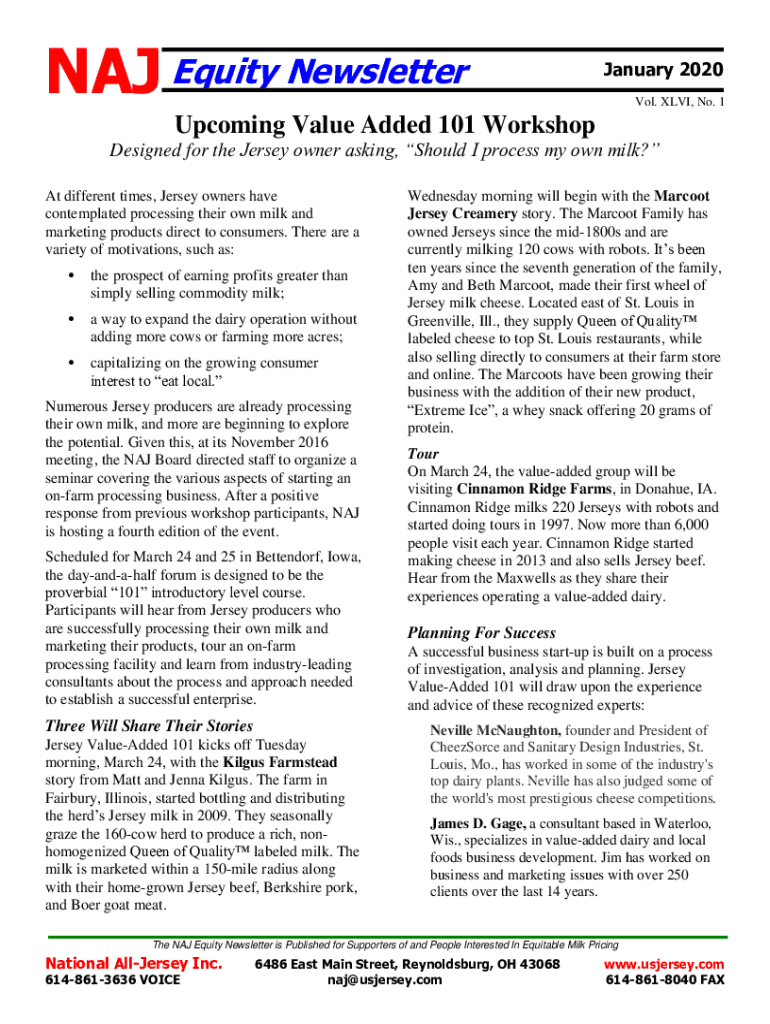 NAD Equity Newsletter January 2020 Vol. CLVI, No. 1Upcoming Value Added 101 Workshop Designed for the Jersey owner asking, Should I process my own milk? At different times, Jersey owners have contemplated