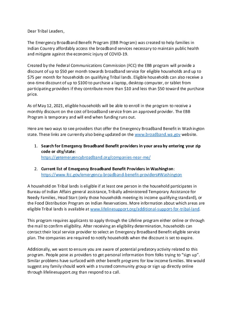 Dear Tribal Leaders, The Emergency Broadband Benefit Program (EBB Program) was created to help families in Indian Country affordably access the broadband services necessary to maintain public health