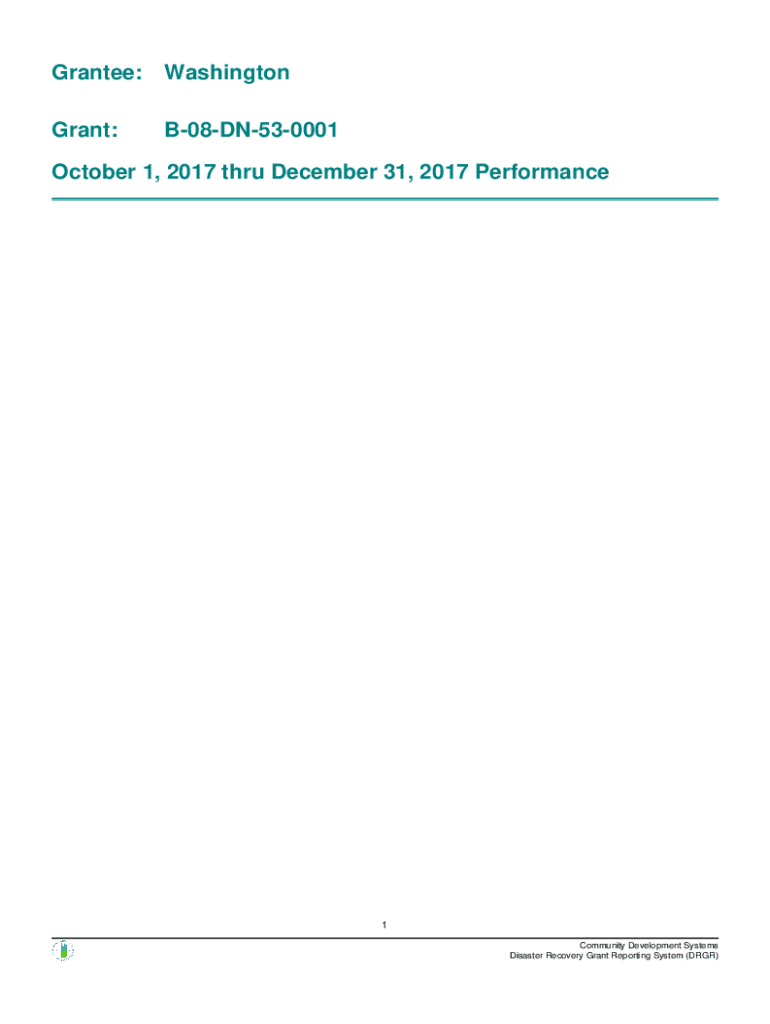 Grantee:Washington Grant:B08DN530001October 1, 2017 through December 31, 2017 Performance1 Community Development Systems Disaster Recovery Grant Reporting System (DRG)Grant Number:Obligation Date:Award
