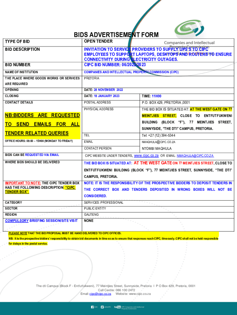 BIDS ADVERTISEMENT FORM TYPE OF BIDDEN TENDER BID DESCRIPTION BID NUMBERINVITATION TO SERVICE PROVIDERS TO SUPPLY UPS TO CPC EMPLOYEES TO SUPPORT LAPTOPS, DESKTOPS AND ROUTERS TO ENSURE CONNECTIVITY