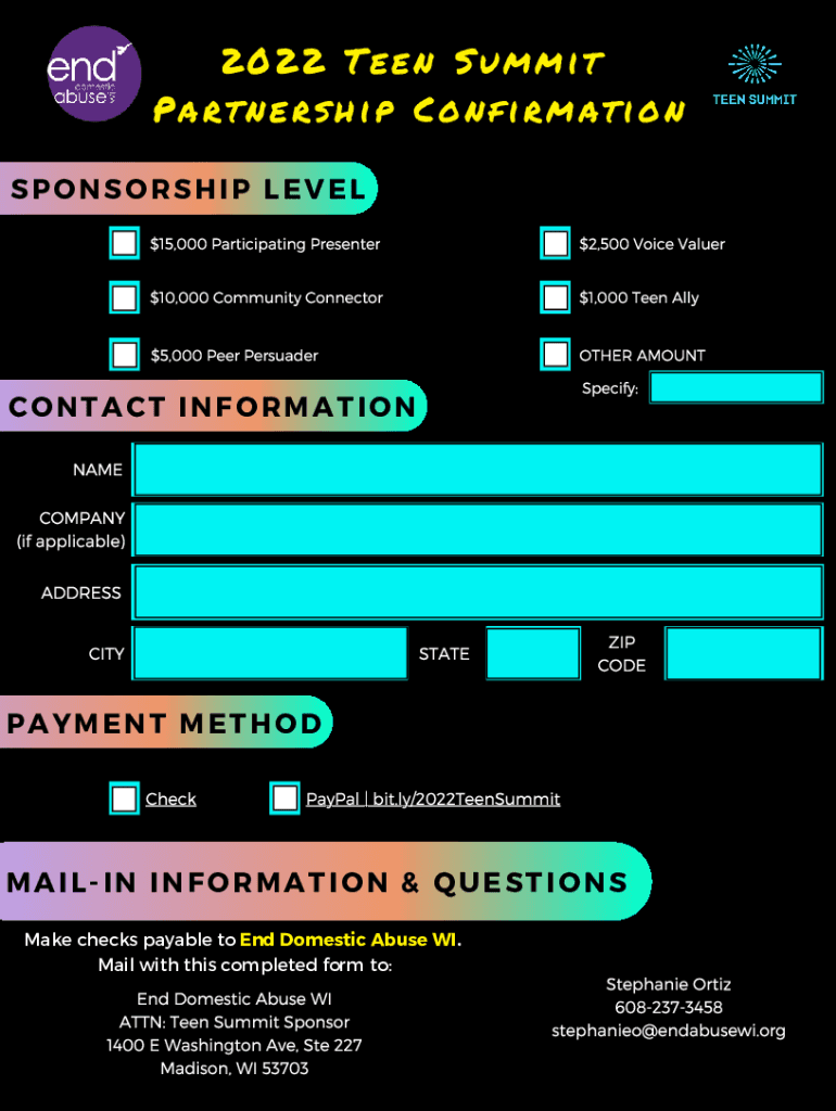 2022 Teen Summit SPONSOR BENEFITS The annual Teen Summit is End Domestic Abuse Wisconsin's The LARGEST TRAINING! Bringing youth, parents, mentors, educators, activists, advocates, and allies from
