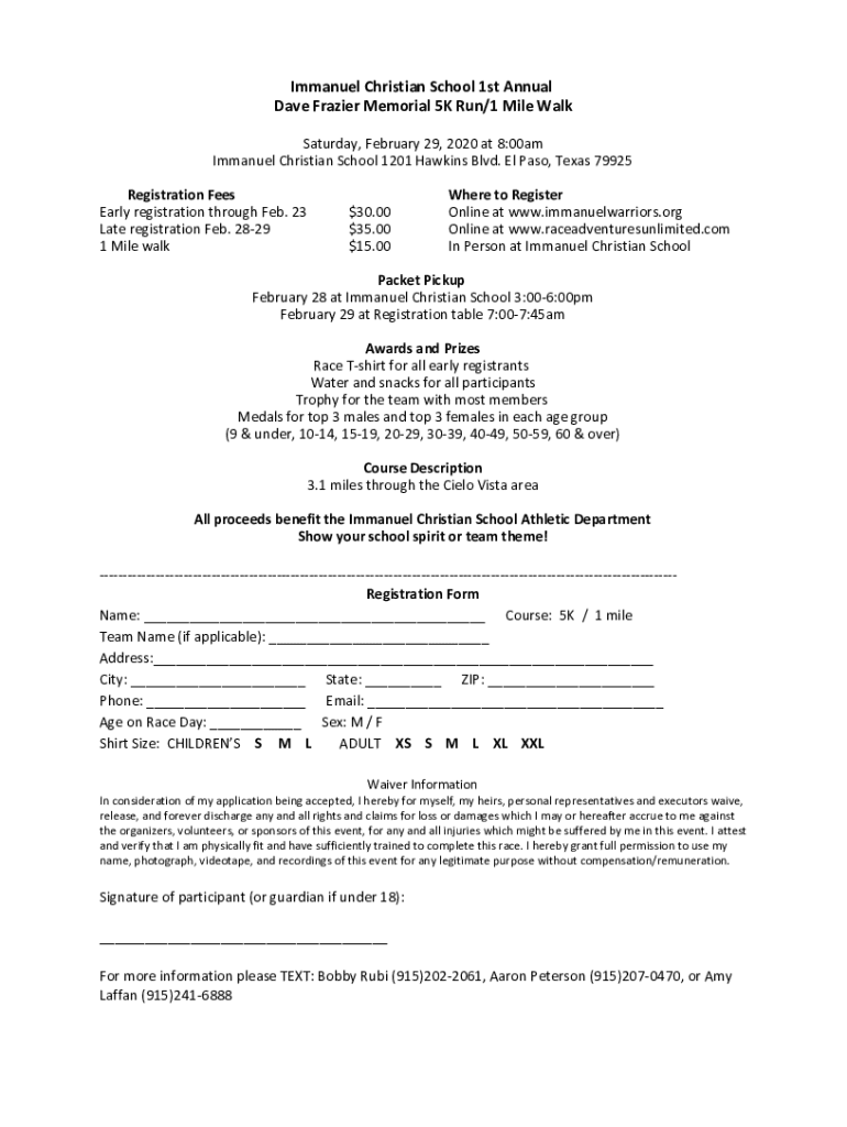 Immanuel Christian School 1st Annual Dave Frazier Memorial 5K Run/1-Mile Walk Saturday, February 29, 2020, at 8:00am Immanuel Christian School 1201 Hawkins Blvd. El Paso, Texas 79925 Registration