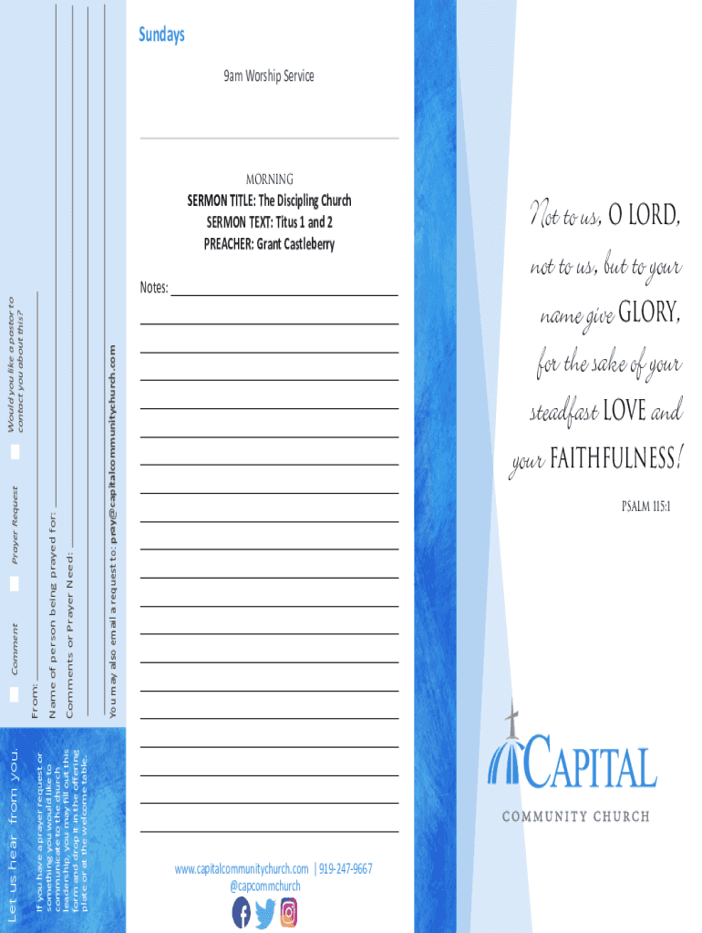 Sundays 9am Worship ServiceMorningSERMON TITLE: The Discipline Church SERMON TEXT: Titus 1 and 2 Preachers: Grant Castle berry Would you like a pastor to contact you about this? Notes: ___You may