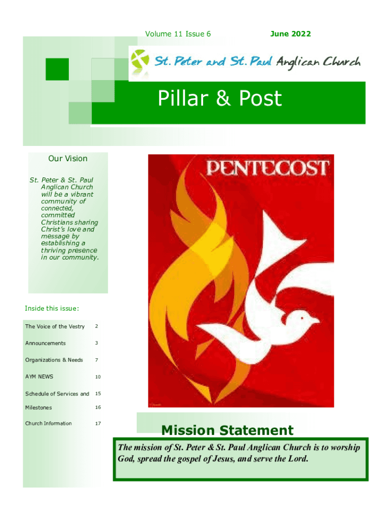 Volume 11 Issue 6June 2022Pillar & Post Our Vision St. Peter & St. Paul Anglican Church will be a vibrant community of connected, committed Christians sharing Christs love and message by establishing