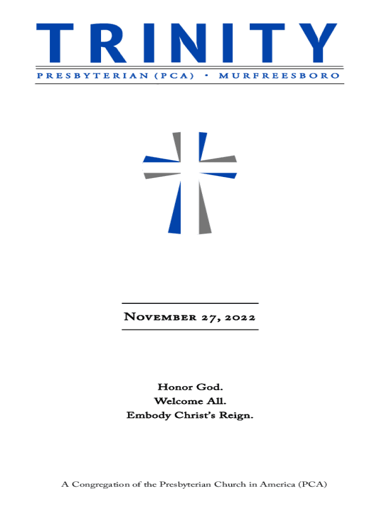 PRESBYTERIAN (PCA).MURFREESBORONovember, Honor God. Welcome All. Embody Christs Reign. A Congregation of the Presbyterian Church in America (PCA)Order for the Worship of God November 27, 2022First