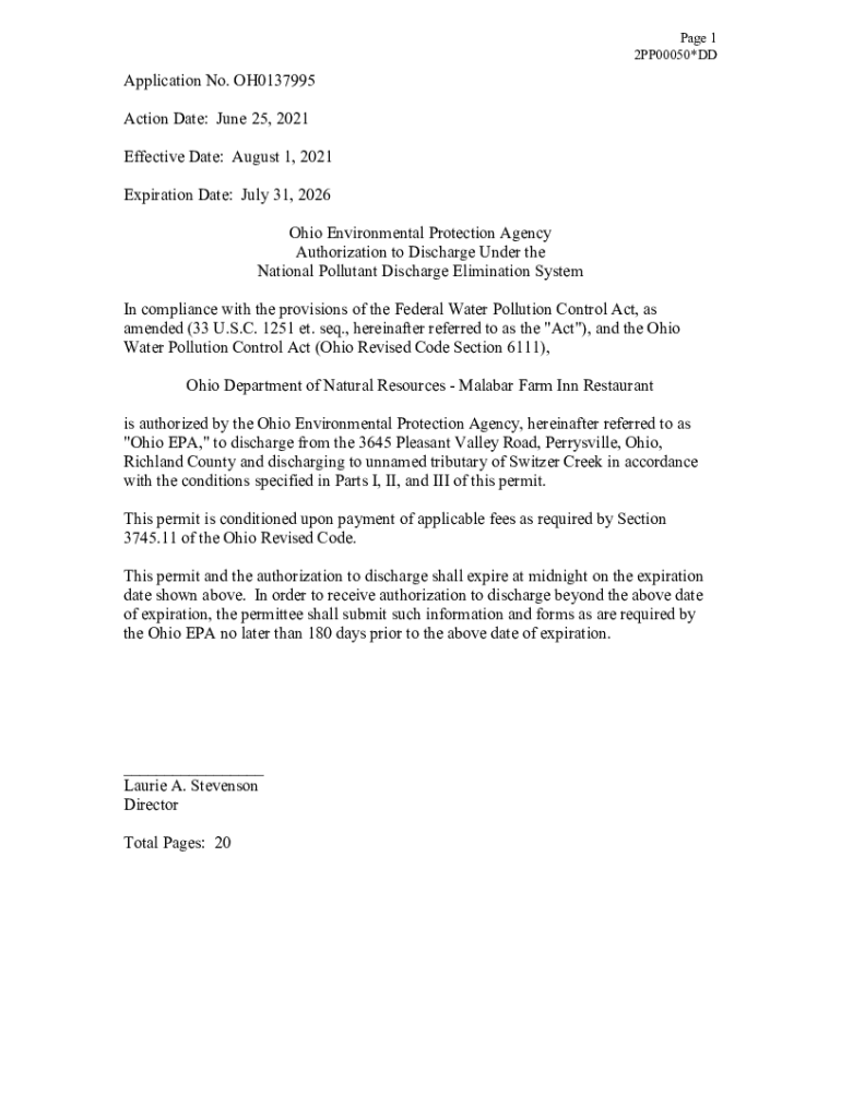 Page 1 2PP00050×Application No. OH0137995 Action Date: June 25, 2021, Effective Date: August 1, 2021, Expiration Date: July 31, 2026 Ohio Environmental Protection Agency Authorization to Discharge