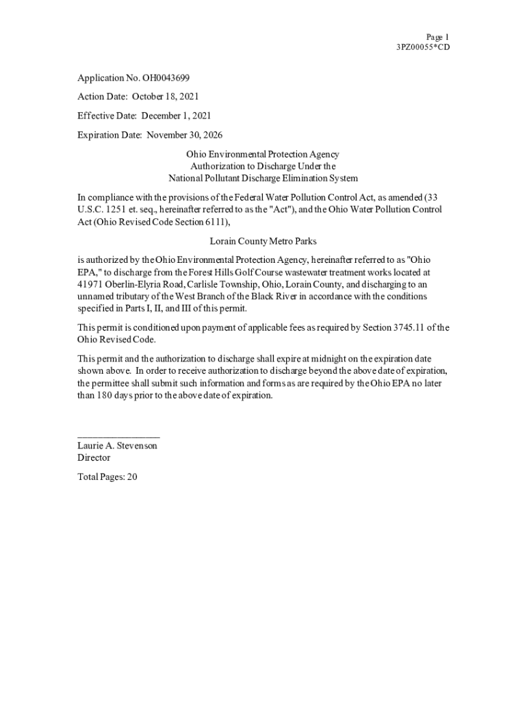 Page 1 3PZ00055×Application No. OH0043699 Action Date: October 18, 2021, Effective Date: December 1, 2021, Expiration Date: November 30, 2026 Ohio Environmental Protection Agency Authorization to