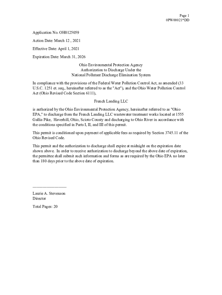 Page 1 0PW00021×Application No. OH0125059 Action Date: March 12, 2021, Effective Date: April 1, 2021, Expiration Date: March 31, 2026 Ohio Environmental Protection Agency Authorization to Discharge
