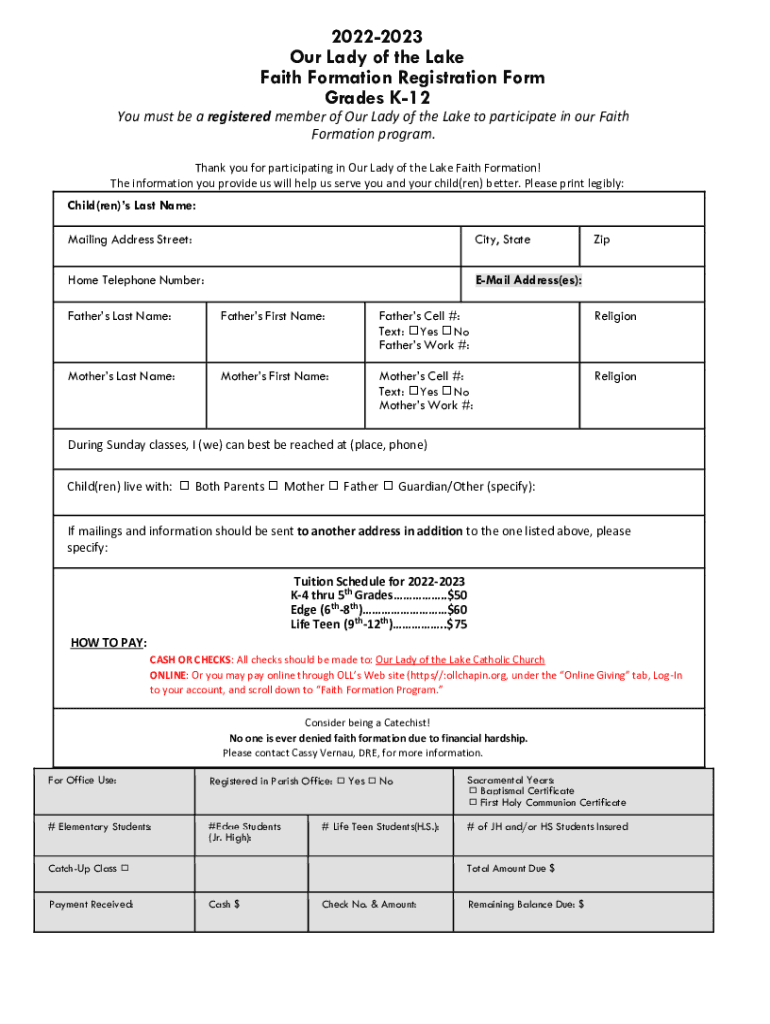 20222023 Our Lady of the Lake Faith Formation Registration Form Grades K12 You must be a registered member of Our Lady of the Lake to participate in our Faith Formation program. Thank you for participating
