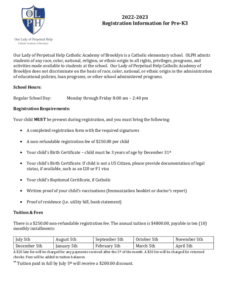 20222023 Registration Information for PreK3Our Lady of Perpetual Help Catholic Academy of Brooklyn is a Catholic elementary school. OLP admits students of any race, color, national, religion, or ethnic