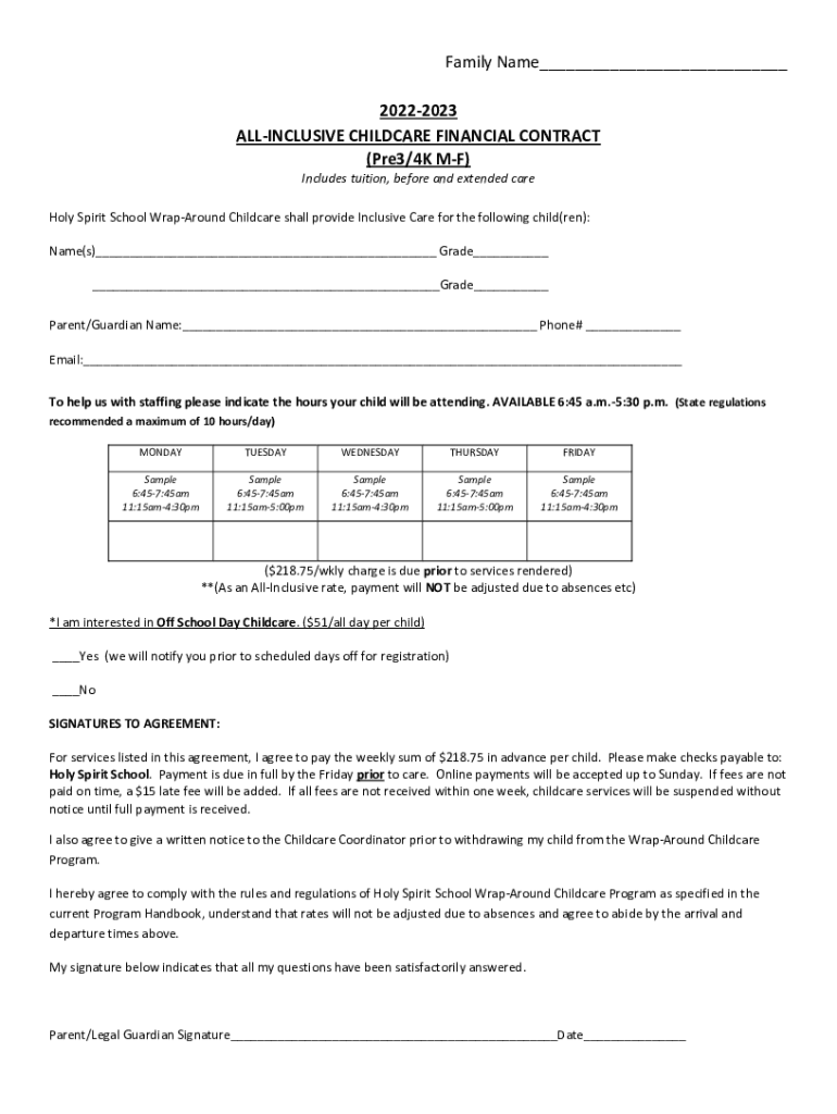 Family Name___ 20222023 INCLUSIVE CHILDCARE FINANCIAL CONTRACT (Pre3/4K MF) Includes tuition, before and extended care Holy Spirit School Wraparound Childcare shall provide Inclusive Care for the