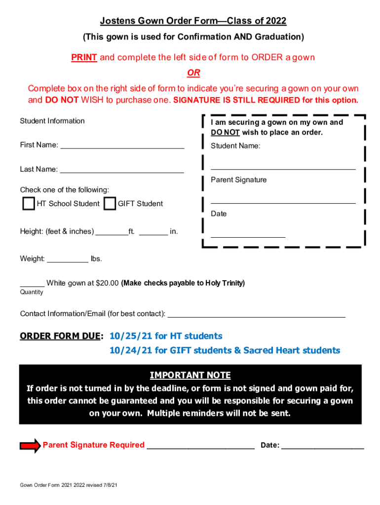 Posters Gown Order Formulas of 2022 (This gown is used for Confirmation AND Graduation) PRINT and complete the left side of form to ORDER a gown OR Complete box on the right side of form to indicate